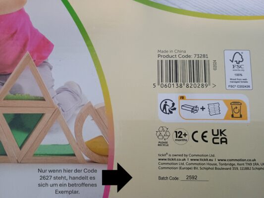 Das Sicherheitsproblem betrifft die Chargennummer 2627. Diese Charge wurde im Zeitraum Juli 2025 – März 2026 verkauft. Wenn Sie die Verpackung der Bausteine noch haben, können Sie die Chargennummer auf dem Etikett überprüfen.