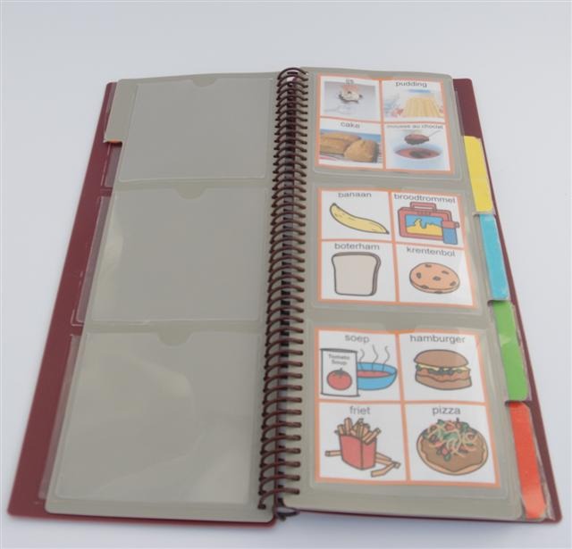 5 Seiten sind doppelseitig mit Einstecktaschen von 8,5 x 8,5 cm versehen, in welche einzelne Piktogramme oder kleine Kommunikationskarten mit mehreren Abbildungen gesteckt werden können.