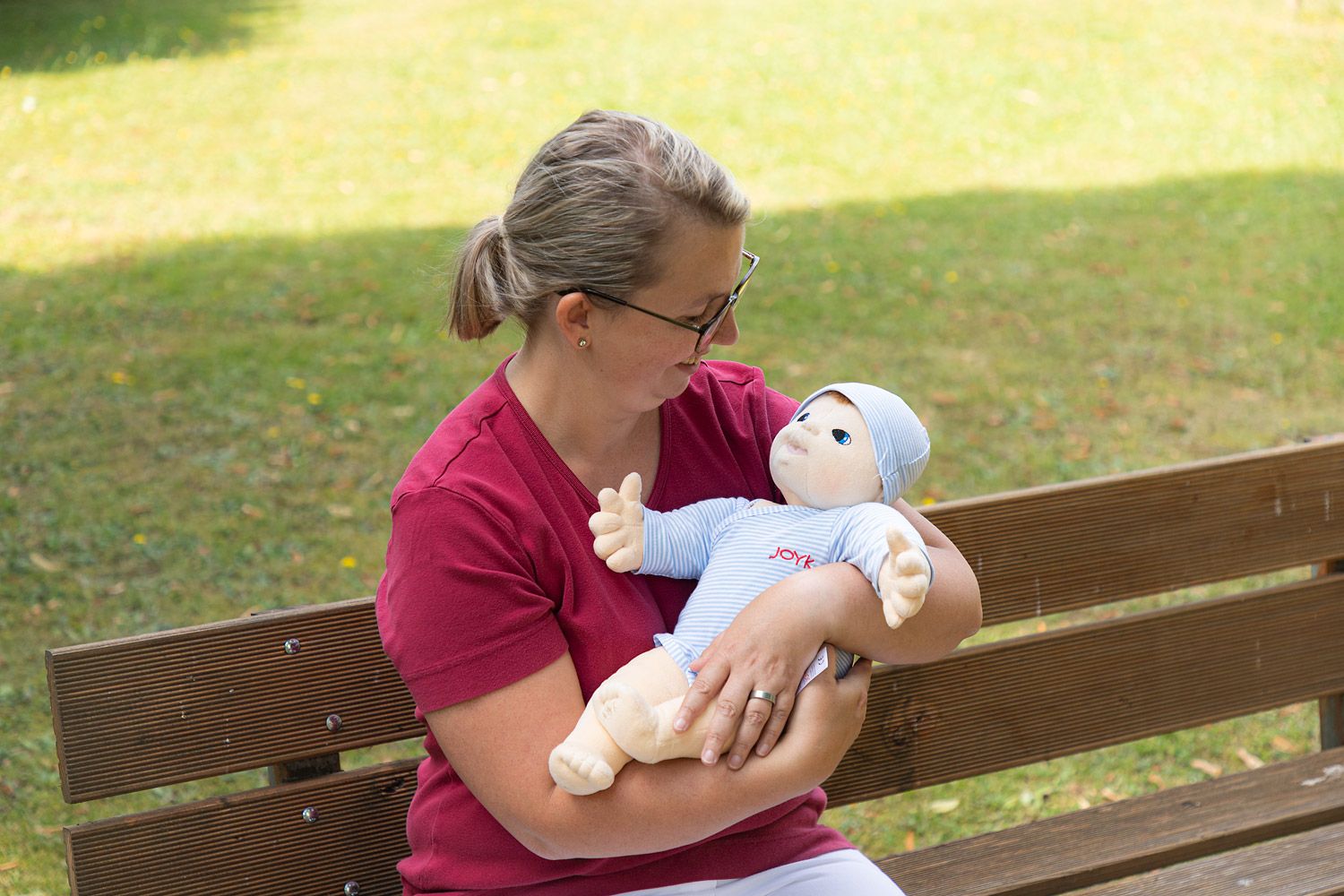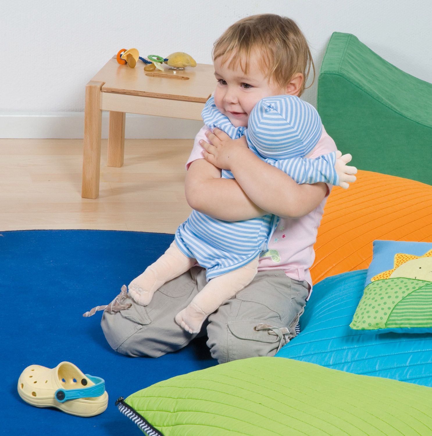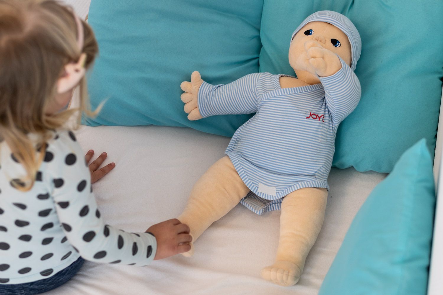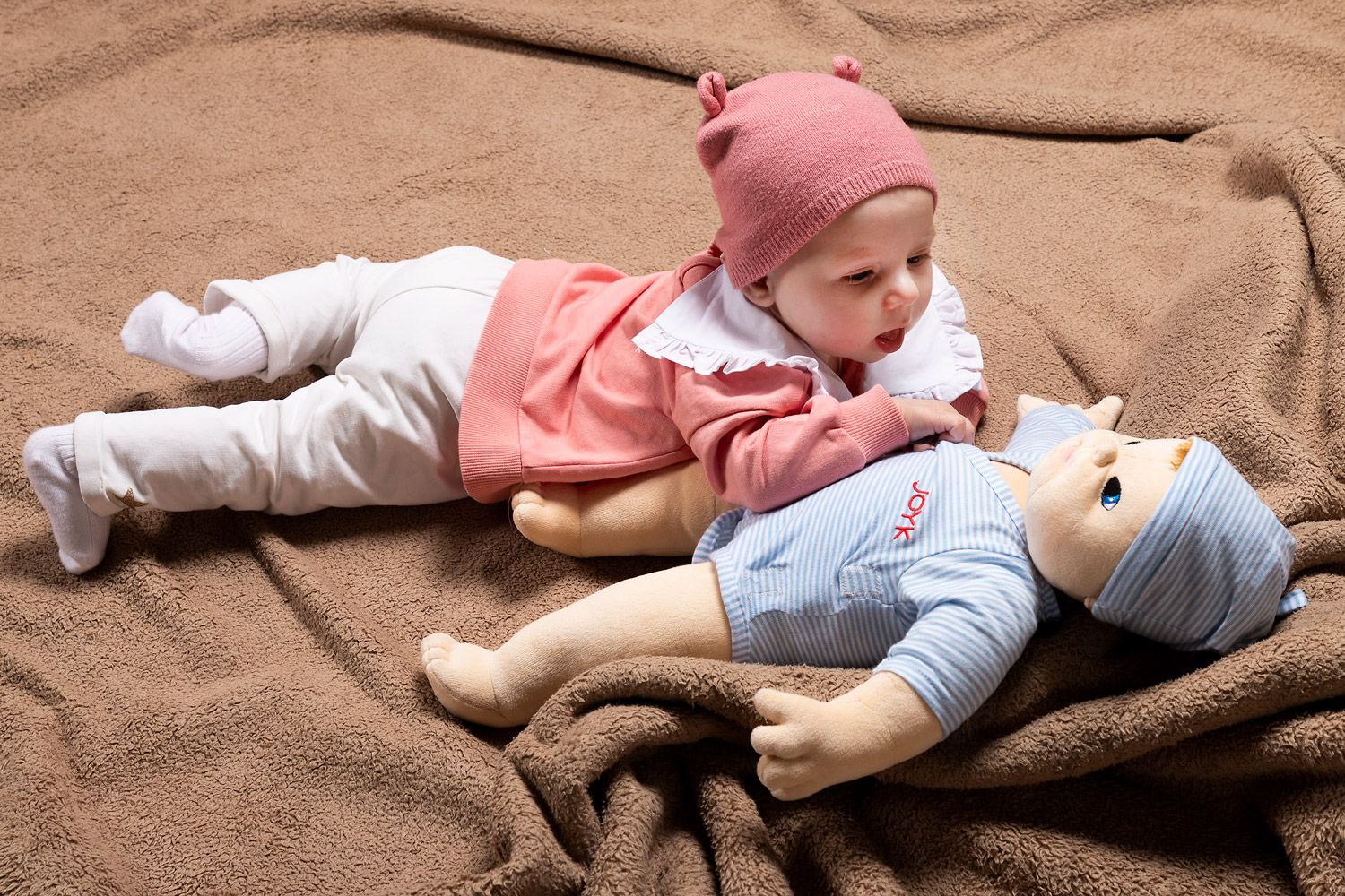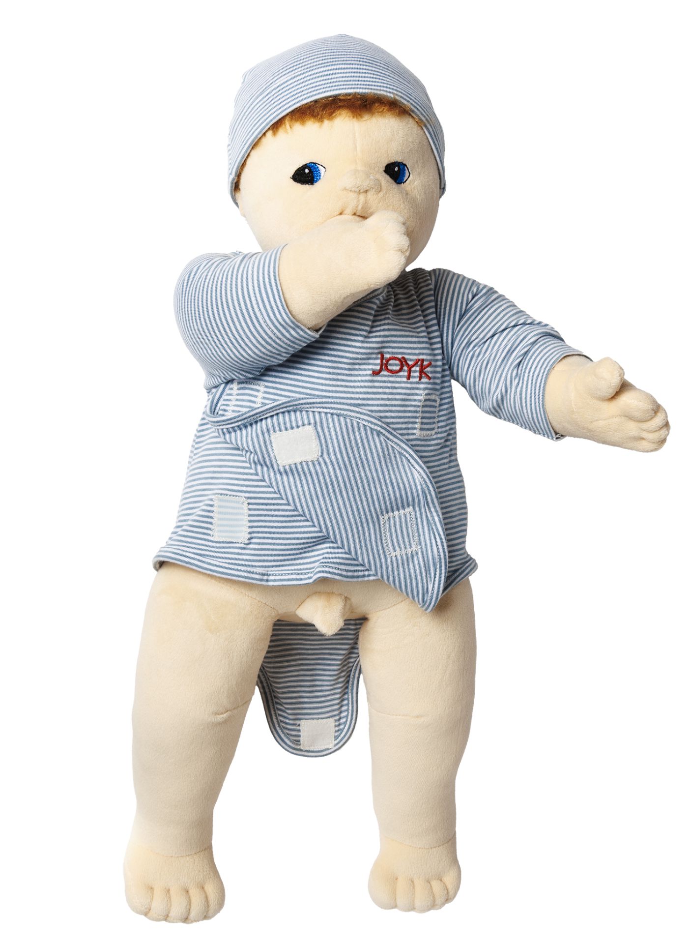 Joyk Puppen ziehen sofort die Aufmerksamkeit auf sich. Mit ihrem speziellen Gesichtsausdruck scheint es, als ob sie einen wirklich anschauen, vor allem wenn man sie auf dem Schoß hat oder im Arm hält. Durch ihr Gewicht fühlen sie sich ebenfalls wie ein richtiges Kind an. Die Joyk Puppe bleibt wegen ihrer erschwerten Unterseite sogar sitzen.
