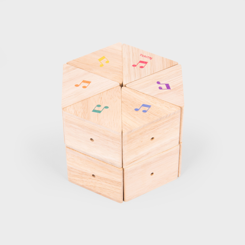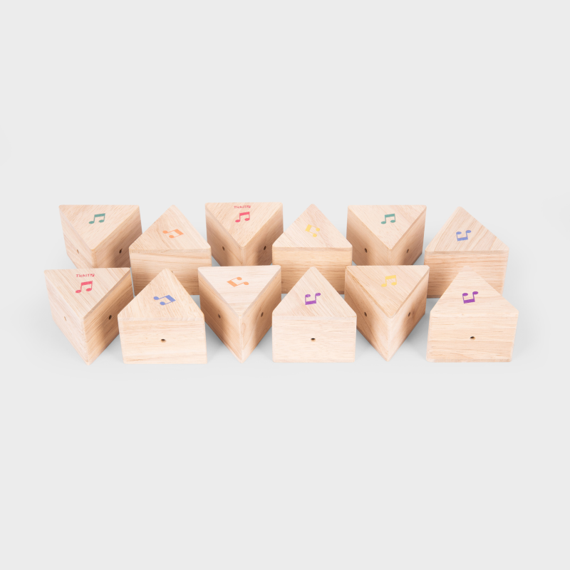 Schön formgegeben holzernen drei-eckigen Blöckchen. 6 Paar Blöcke zu Erkennen an farbigen Musiknoten und vor allem am Musikton.