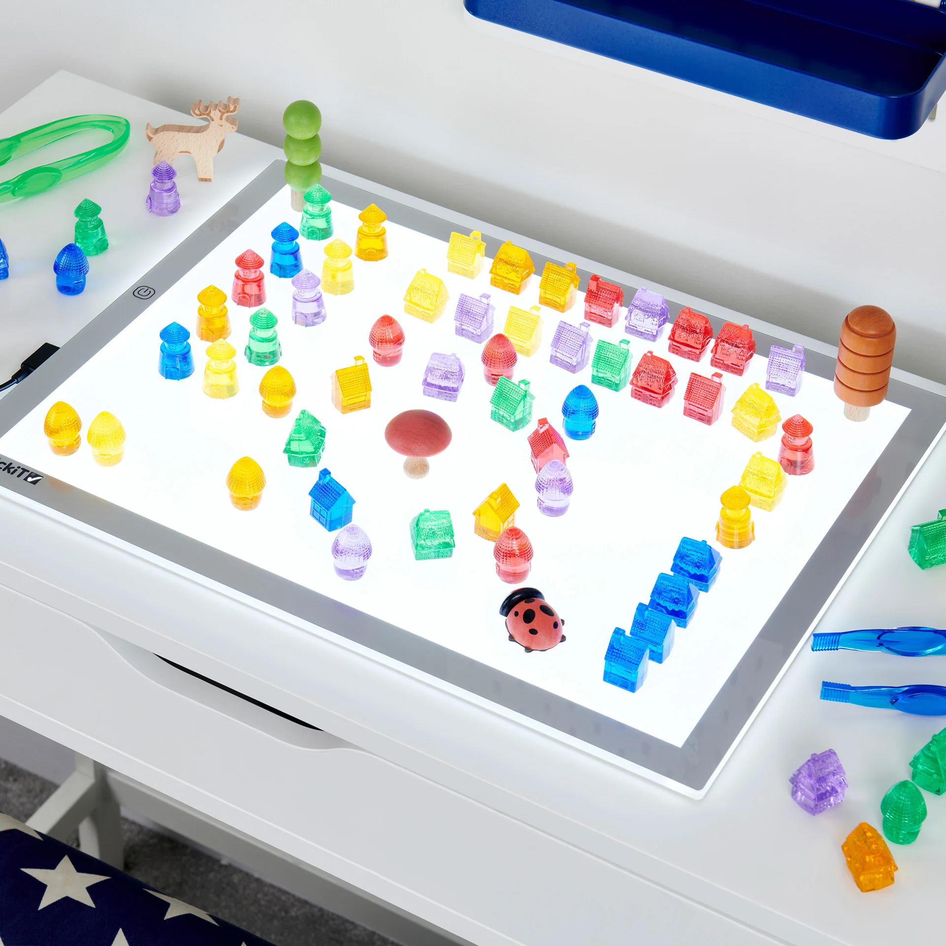 Rechteckiges Leuchtpanel mit heller und gleichmäßiger LED-Hintergrundbeleuchtung, auf dem jedes Spielzeug noch mehr zum Strahlen gebracht wird. Wunderbar geeignet um Muster, Formen und Farben verschiedener lichtdurchlässiger Gegenstände zu erkunden, oder um beim Malen einfach mal Abzupausen.