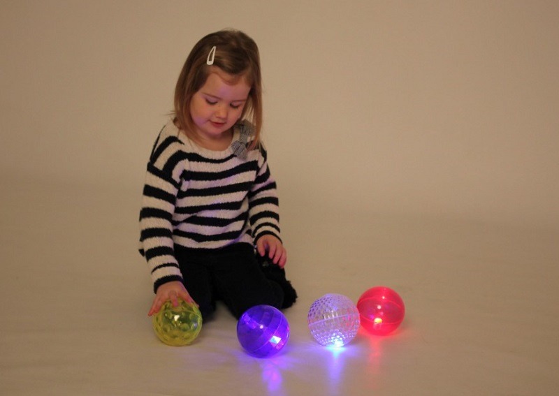 Wirf die sensomotorischen Bälle auf den Boden und sie fangen an zu blinken. Dies stimuliert die sensorische Integration.