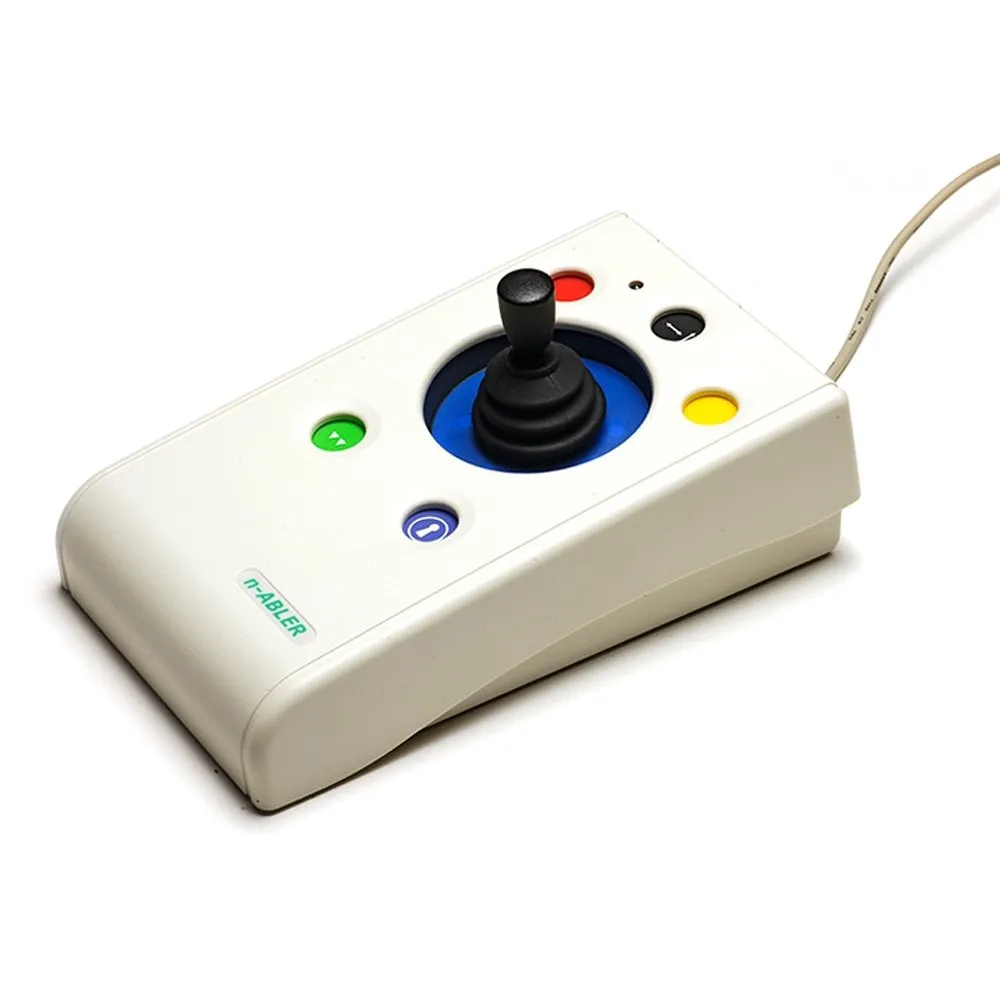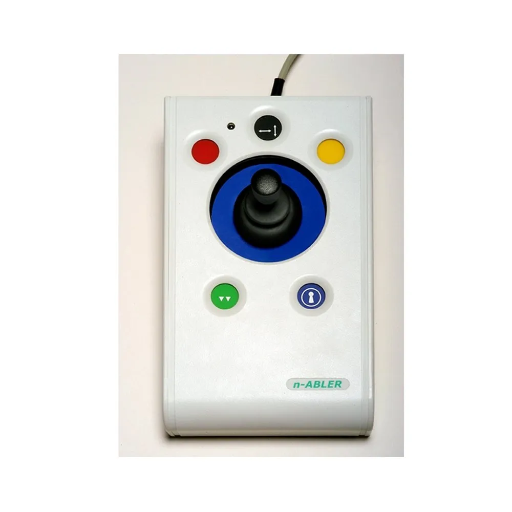 Der n-ABLER Joystick ist ein robuster Joystick zur Steuerung des Mauszeigers. Die fünf farbigen Tasten haben die Mausfunktionen Klick, Rechtsklick, Doppelklick, Ziehen sowie horizontales und vertikales Scrollen. Die Tasten sind vertieft, so dass der Benutzer seine Hand auf dem Gehäuse ablegen kann. Die linke und die rechte Maustaste sind austauschbar, so dass der Joystick sowohl von Rechts- als auch von Linkshändern verwendet werden kann. Der Joystick hat auch 2 Anschlüsse für externe Schalter, so dass die Funktionen der linken und rechten Maustaste übernommen werden können.