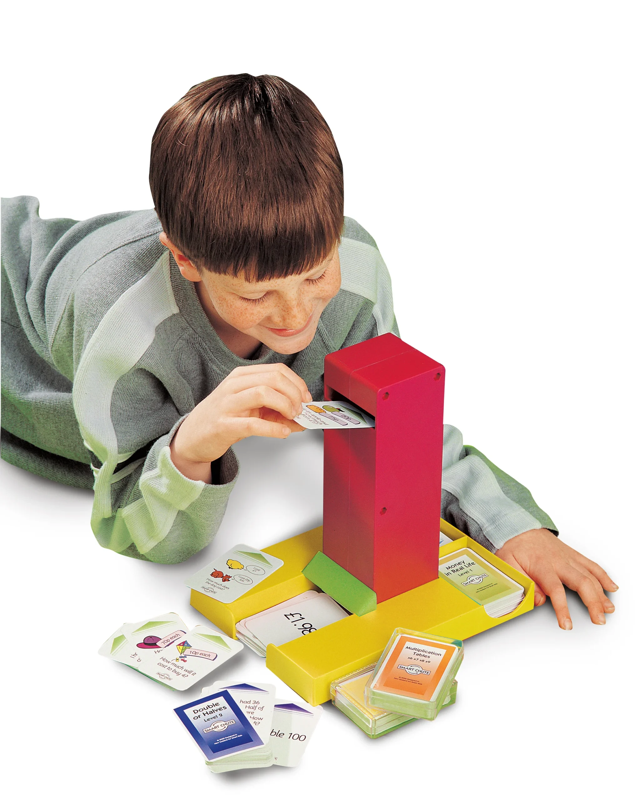 Nehmen Sie eine Karte, sagen Sie die Antwort, bevor Sie die Karte in den oberen Schlitz schieben und die richtige Antwort kommt unten heraus.