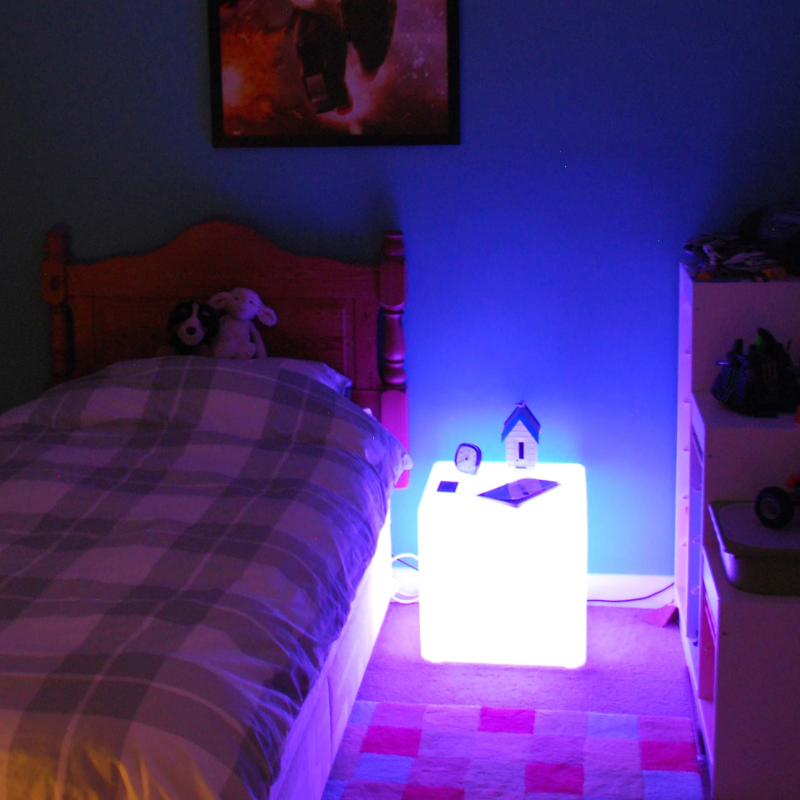 Mit der Fernbedienung können Sie die Farbe des Würfels bequem umschalten oder eins der 4 Farbwechsel-Programme einstellen. Die robuste Plastikform kann auch als Hocker verwendet werden.