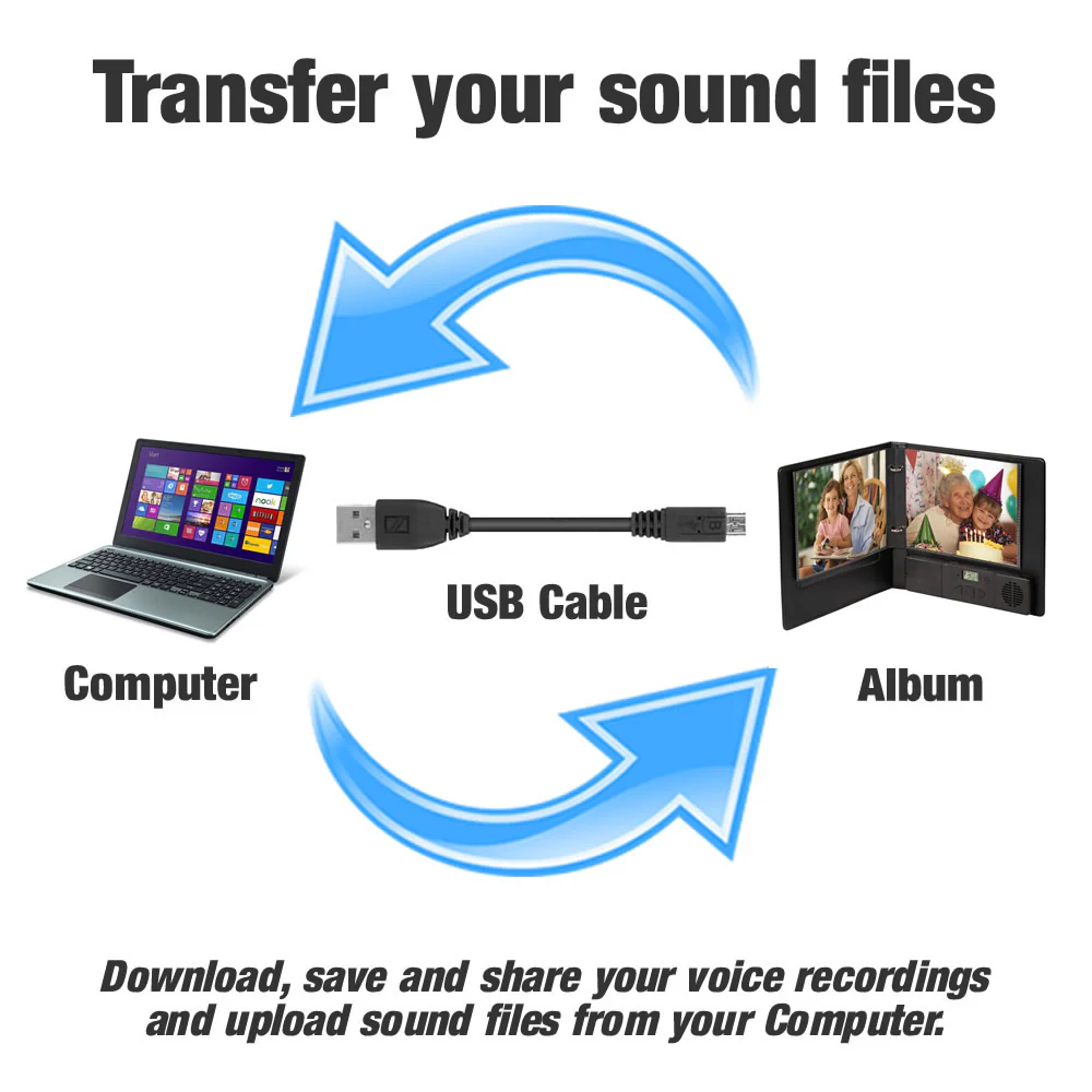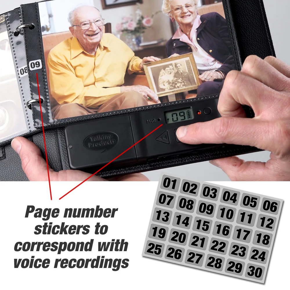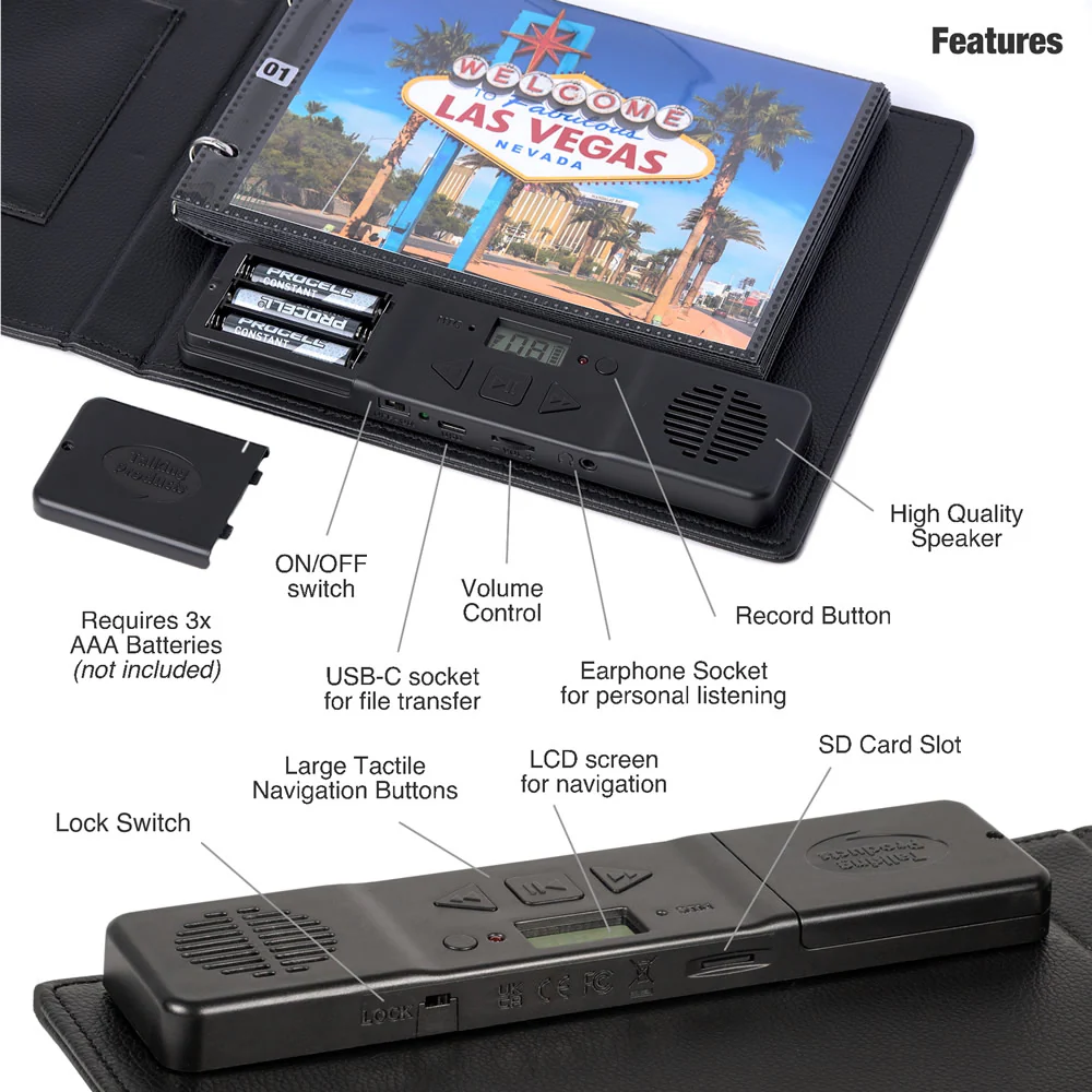 Diese aufwendige Ausgabe des sprechenden Fotoalbums hat pro Seite Platz für ein Foto im Format 12,5 x 17,5 cm und eine dazugehörende Geschichte oder Erklärung. Insgesamt bis zu 48 Stunden Aufnahmezeit. Das können lange Geschichten sein oder auch ein Stück Musik. Während des Abspielens kann eine Pause eingelegt werden, indem man die PLAY Taste drückt. Mit noch einem Druck auf die Taste geht die Geschichte oder die Musik wieder weiter.